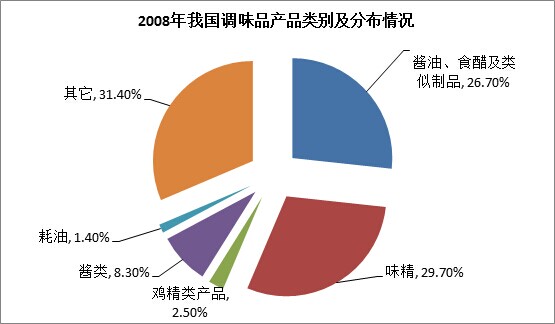 鸡精产品在我国的规模化生产始于上世纪90年度初期,历经十余年的快速发展,鸡精行业标准于2003年正式颁布,开始了行业的有序竞争。总体来说,鸡精行业处于快速成长阶段,呈现出健康的发展态势。目前,鸡精类产品在调味品行业中的地位日益重要。由如下2008年度我国调味品产品类别可见: